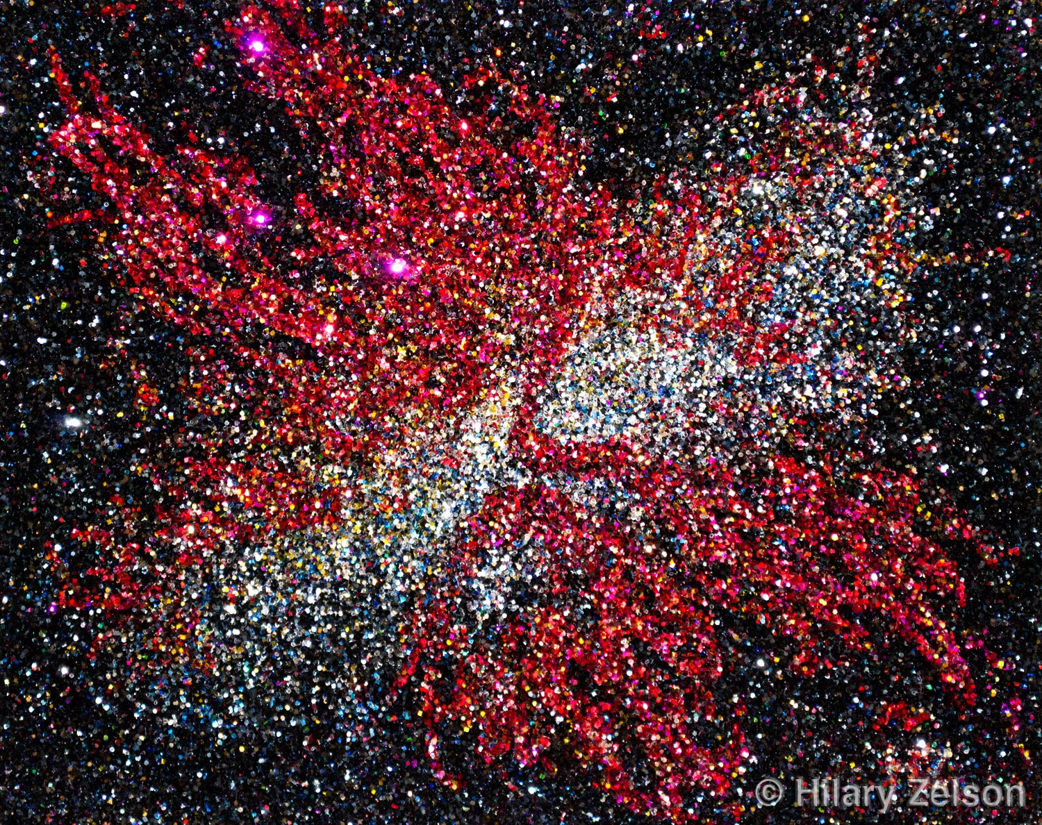 Over the past three years my artwork has reflected my fascination with glitter, and with science, in particular with cosmic forms and Hubble Space Telescope images. To me, the beauty in these other worldly forms of our universe is truly captivating, but I feel a disconnect between what the telescope images capture and how it would really appear if we could travel to the distant corners of space and see for ourselves.